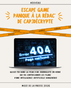 Et c’est parti pour une nouvelle édition de notre Mois de la Presse du 2 au 27 mars avec une grosse nouveauté : le lancement de notre Escape Game Panique à la rédac’ de CapJDécrypte à tester gratuitement dans nos locaux du 70 Avenue Borriglione. Rendez-vous le 24 mars à 10h.