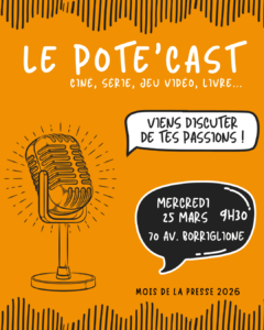 Le lendemain, place à un atelier Pote’Cast spéciale Culture. Venez discuter de vos passions (ciné, série, livre, jeu vidéo…) autour d’un micro.